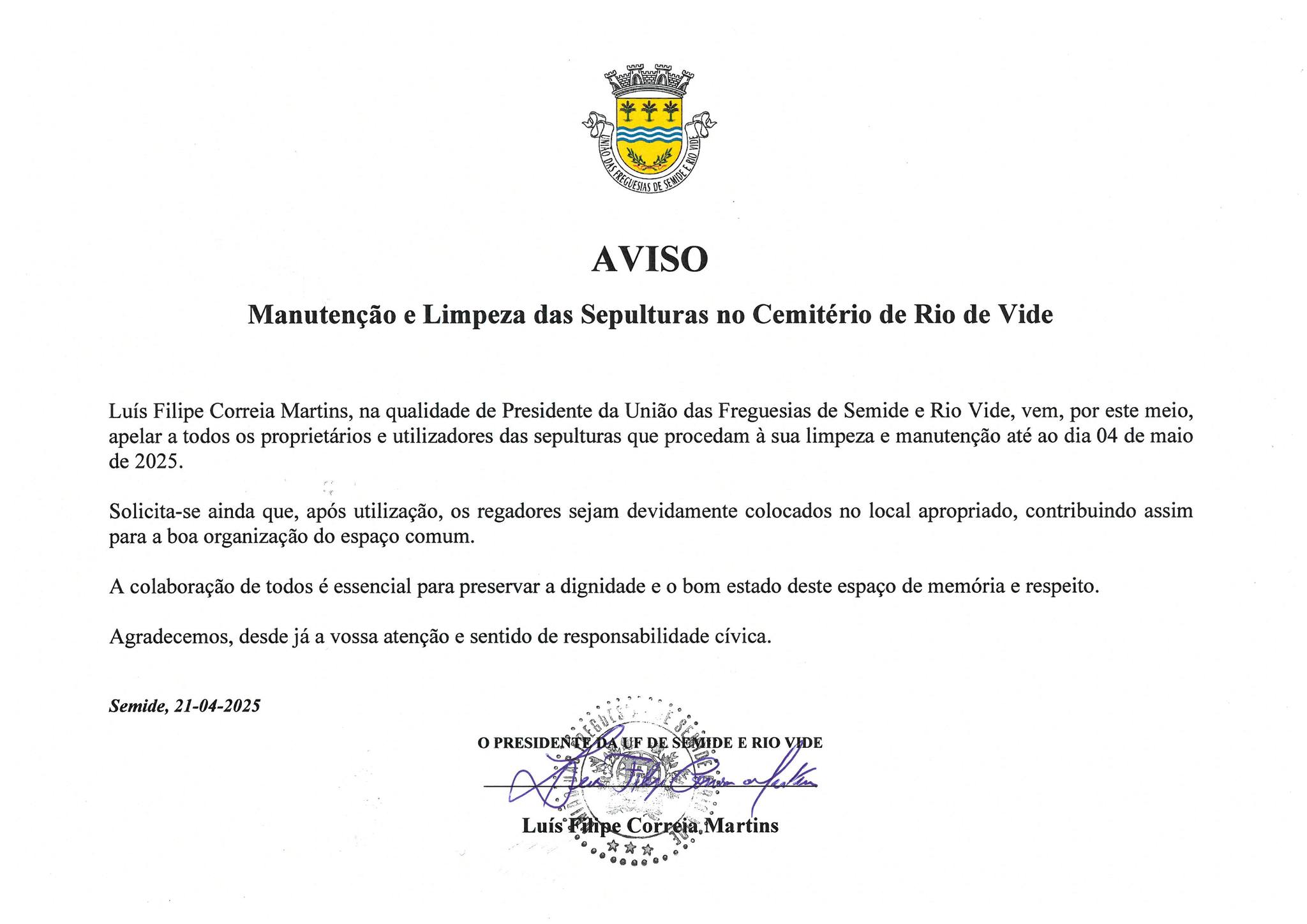 Solicita-se a melhor colaboração e entendimento de todos os proprietários e/ou utilizadores dos cemitérios de Semide e Rio de Vide, e que até às 23h59m do dia 4 de Maio de 2025 tenham as suas sepulturas limpas e os corredores estejam desobstruídos e livres de pedras (de campas), lanternas, jarras e outros objetos.