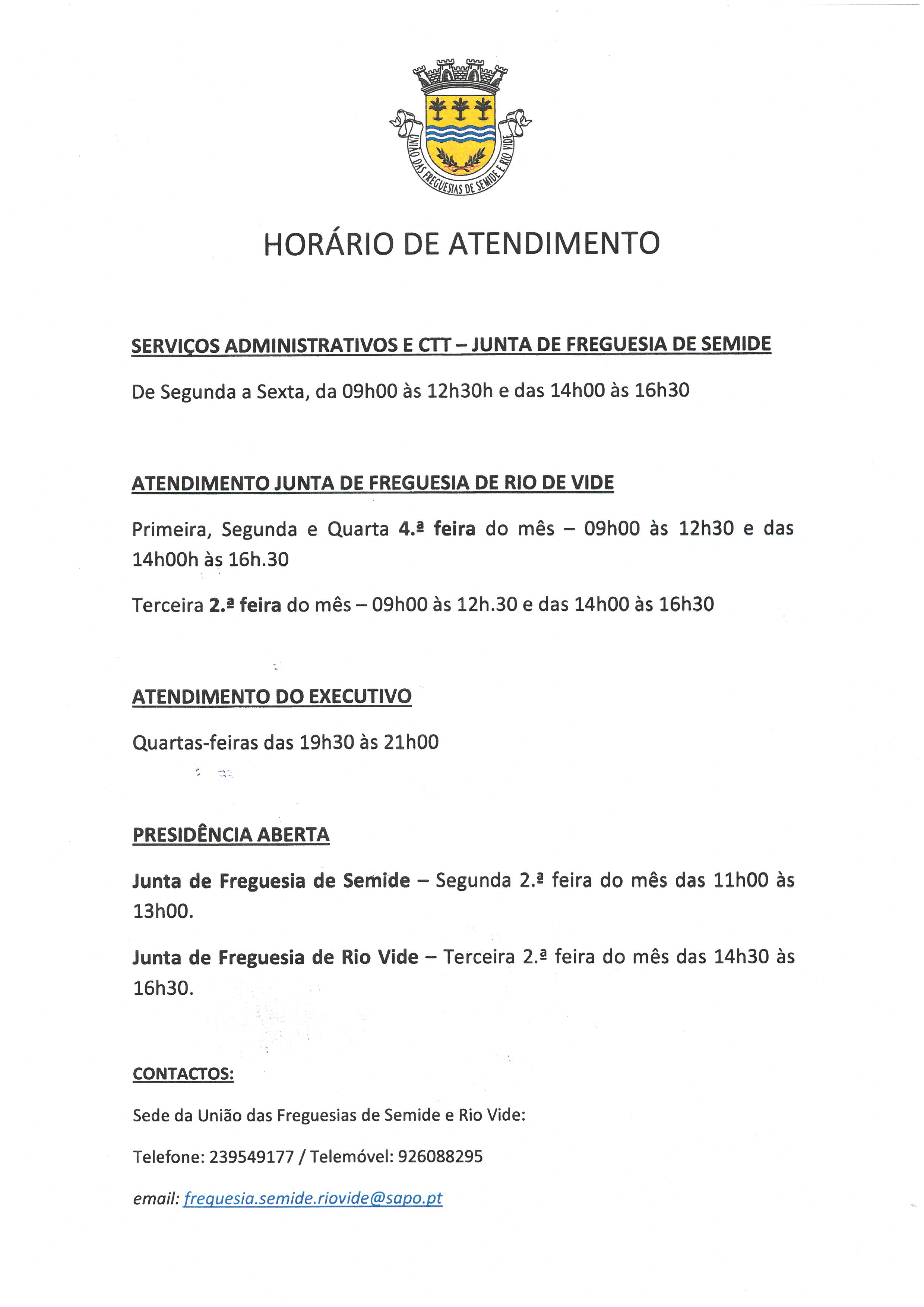 Junta de Freguesia de Semide - Segunda 2.ª feira do mês das 11h00 às 13h00.