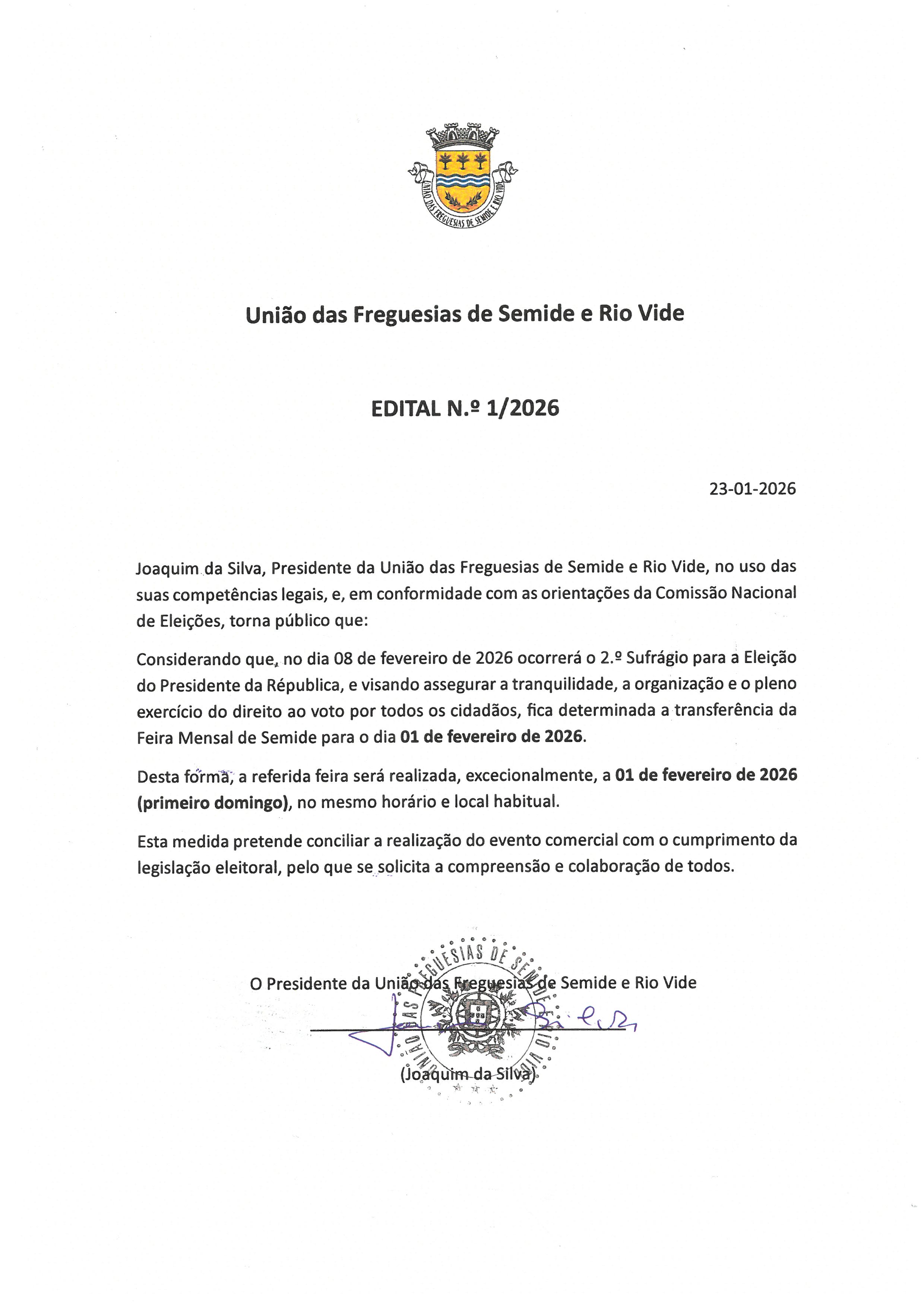 Junta de Freguesia de Rio Vide - Terceira 2.ª feira do mês das 14h30 as 16h30.